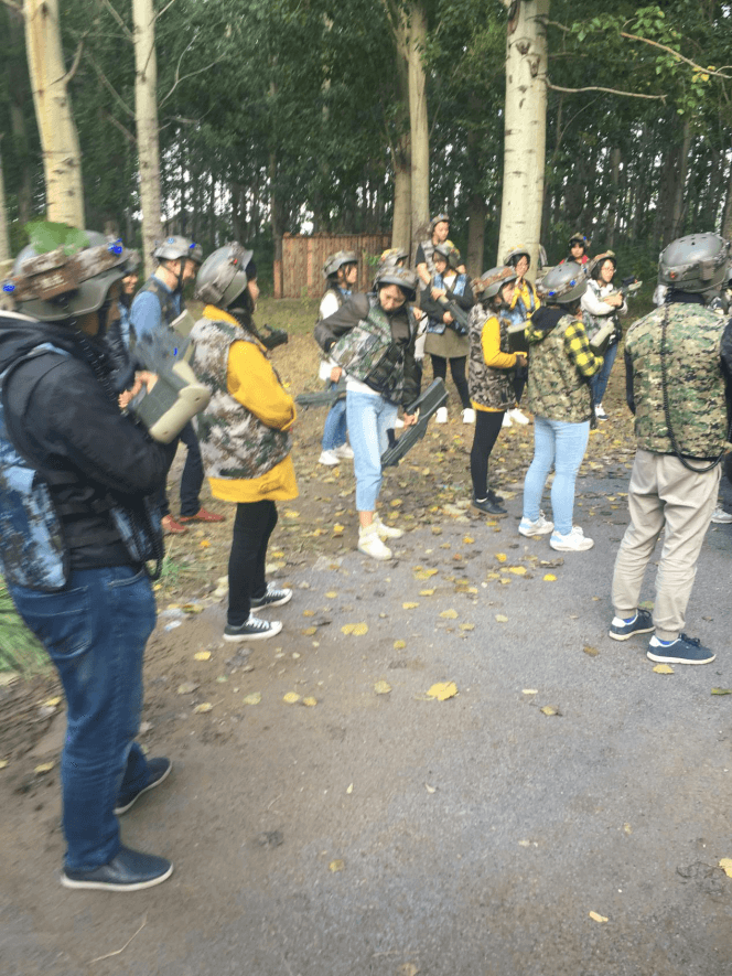 酒足飯飽后,開始正式步入真人CS活動,同樣是按人數(shù)依次分為兩組:猛虎隊與武松隊,穿好服裝、拿好裝備,等待教練講好游戲規(guī)則后,兩組戰(zhàn)士們在小樹林中開戰(zhàn)。