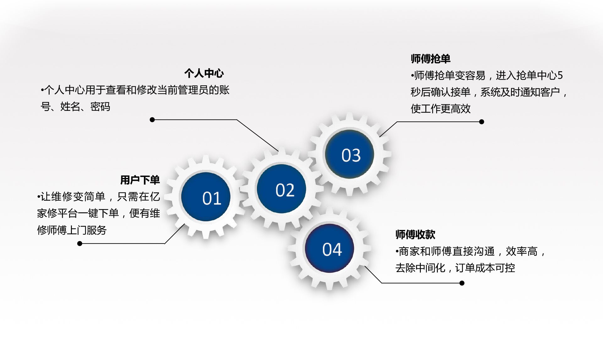 億家修系統(tǒng)平臺(tái)提供完善的團(tuán)隊(duì)管控角色,增強(qiáng)項(xiàng)目權(quán)限分離。系統(tǒng)支持微信等多終端支付方式,方便業(yè)主在線支付,完成全國推廣任務(wù),提升運(yùn)維及商務(wù)運(yùn)作能力。